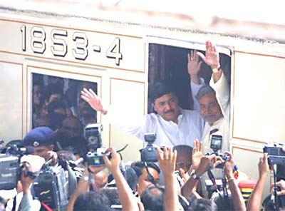 ahajan and Nitish Kumar wave to the press photographers gathered at the Victoria Terminus to record the re-run.