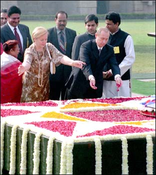 Putin and wife Lyudmila place flowers at the Mahatma Gandhi Samadhi at Rajghat in New Delhi. Back | Start