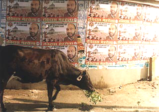 Unconcerned about the elections, this cow seems to be ruminating over its food in front of a Samajwadi Party poster. Back Next