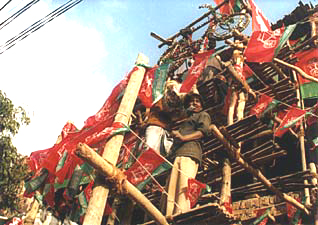 Construction workers show their support for the Samajwadi Party in Old Lucknow by displaying a cycle -- the party's symbol. But like the cycle, SP chief Mulayam Singh Yadav's fate, too, hangs precariously. Back Next