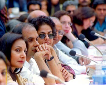 Imtiaz Dharker (second from left), Pico Iyer and Gita Hariharan listen to a speaker at the Neemrana retreat.