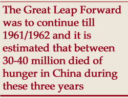 Only one man tried to raise his voice against the general madness and sycophancy. This was Marshall Peng Denhai, defence minister and old companion of Mao during the Long March. Marshal Peng, who was a simple, honest and straightforward officer [the Dalai Lama once told me: 'He was my favourite Chinese'], wrote a long personal letter to Mao about what he had seen in the countryside and the misery of the people. Mao immediately distributed his friend's critics to all the Party cadres and 'purged' old Peng. The Great Leap Forward was to continue till 1961/1962 and it is estimated that between 30-40 million died of hunger in China during these three years. The book, The Hungry Ghosts: Mao's Secret Famine by Jasper Becker has brilliantly documented this tragedy.