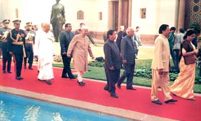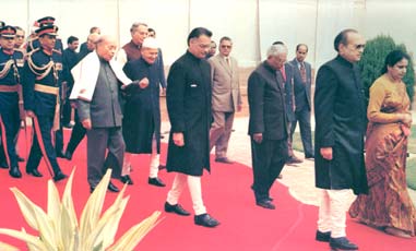 Bottom: February 26, 1997. President Dr Shankar Dayal Sharma, accompanied by Vice-President K R Narayanan, Prime Minister H D Deve Gowda, Lok Sabha Speaker Purno A Sangma, Parliamentary Affairs Minister Srikant Jena, V S Rama Devi, then the secretary-general, Rajya Sabha, and S Gopalan, then the secretary-general, Lok Sabha.