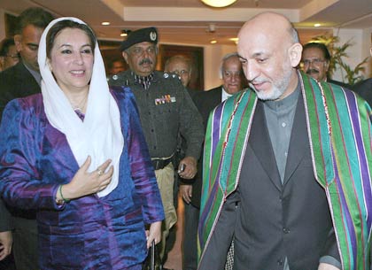 Afghanistan President Hamid Karzai with former Pakistan prime minister Benazir Bhutto after their meeting at a hotel in Islamabad on Thursday. Bhutto was assasinated hours later after a political rally in Rawalpindi.