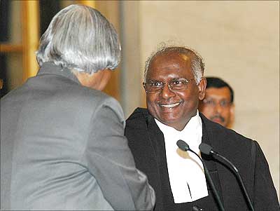 Image: President A P J Abdul Kalam greets Chief Justice K G Balakrishnan after administering him the oath of office at Rashtrapati Bhavan.