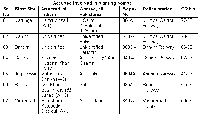 21. In pursuance of the aforesaid conspiracy, the said accused persons advocated, abetted, advised and incited the Indian Muslim youths and knowingly facilitated the commission of terrorist act to wit cause bomb explosions in seven first class compartments of western railway trains in Mumbai on 11.07.2006. Accused persons namely (1) Asif Khan Bashir Khan @ Junaid (A-13), (2) Mohd Faisal Ataur Rehman Shaikh (A-3), (3) Dr Tanveer Ahmed Mohammed Ibrahim Ansari (A-2), (4) Ehtesham Kutubuddin Siddiqui (A-4), (5) Suhail Mehmood Shaikh (A-10), (6) Zameer Ahmed Latifur Rehman Shaikh (A-11), (7) Mohammed Sajid Margub Ansari (A-7), (8) Abdul Wahid Din Mohammed Shaikh (A-8), (9) Shaikh Mohammed Ali Alam Shaikh (A-6), (10) Muzzammil Ataur Rehman Shiakh (A-9), (11) Rizwan Mohammed Dawrey and (12) Rahil Ataur Rehman Shaikh continued to be members of “Students’ Islamic Movement of India” and remained in contact wiht wanted accused Azam Chima, commander of Lashkar-e-Toiba, both banned terrorist outfits, as declared by the Government of India in the schedule as laid down under section 2 (1) (m) and 35 of Unlawful Activities (Prevention) Act-1967