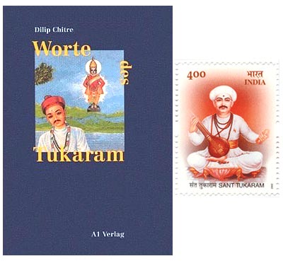 Image: The German translation of Chitre's poems, Worte des Tukaram; an Indian stamp featuring the seventeenth-century poet.