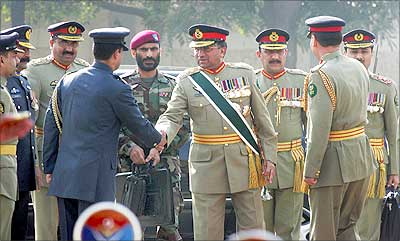 Image: Musharraf shakes hands with an Air Force officer at the general headquarters.
