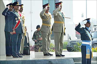Image: Musharraf salutes as air chief Tanveer Mehmud looks on during his farewell visit to the Air Force headquarters in Islamabad.