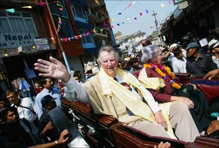 Caption: Sir Edmund Hillary, one of the first two men to climb Mount Everest, waves to the public during a procession through the streets of Kathmandu in May 2003 to celebrate the 50th anniversary of the ascent of the world's highest peak. Hillary and Nepali Sherpa, Tenzing Norgay, climbed the 29,035-foot Everest summit on May 29, 1953.