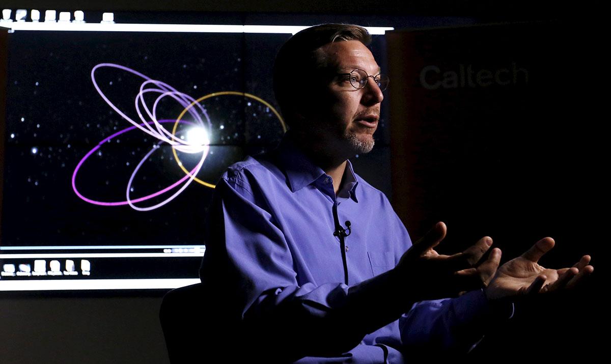 IMAGE: Professor of Planetary Astronomy Mike Brown speaks with a computer simulation of the probable orbit of Planet Nine (yellow) at the California Institute of Technology in Pasadena, California, January 20, 2016. Photograph: Mario Anzuoni/Reuters