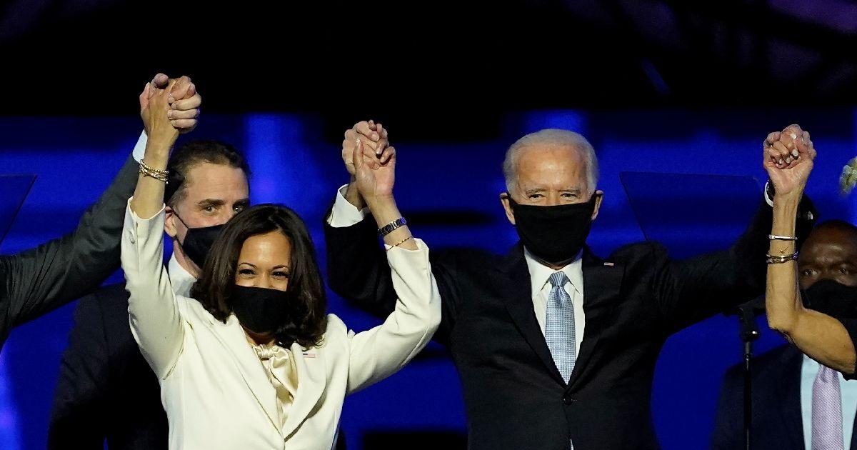 IMAGE: President-elect Joe Biden and Vice President-elect Kamala Harris, celebrate with the families at the victory rally in Wilmington, Delaware, November 7, 2020. Photograph: Andrew Harnik/Pool via Reuters