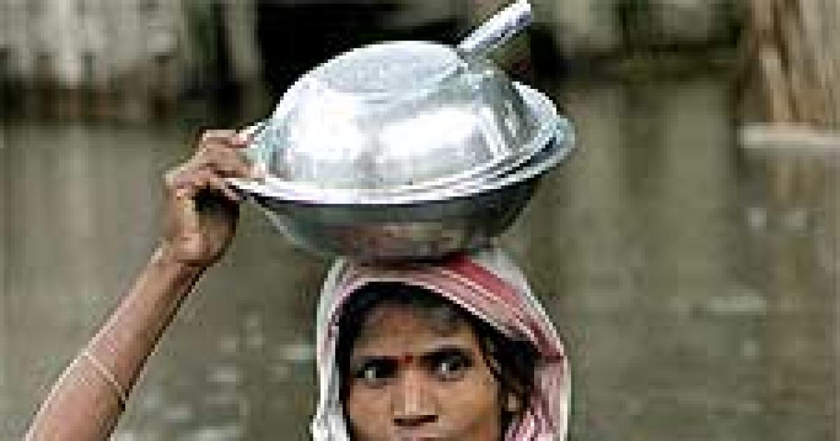 Image: A flood victim carries her kitchen utensils on her head while walking through her flooded neighborhood to a relief camp in the village of Bijuli Bari, in Assam. Photograph: Reuters