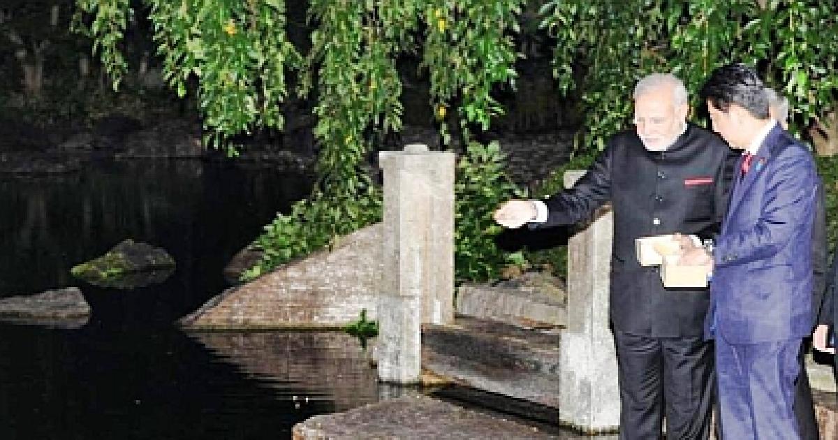 Image: PM Narendra Modi and his Japanese counterpart Shinzo Abe begin engagement in Kyoto following the tradition of feeding the fish. Photograph: MEA/Facebook