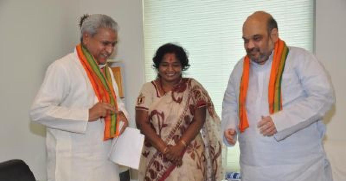 Image: BJP president Dr Tamizhisai Soundararajan (centre) with party president Amit Shah (right).