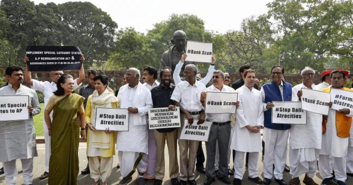 IMAGE: Leaders of various Opposition parties, including United Progressive Alliance Chairperson Sonia Gandhi and Congress President Rahul Gandhi, protest outside Parliament against the government's alleged anti-Dalit policies. Photograph: Kamal Singh/PTI Photo