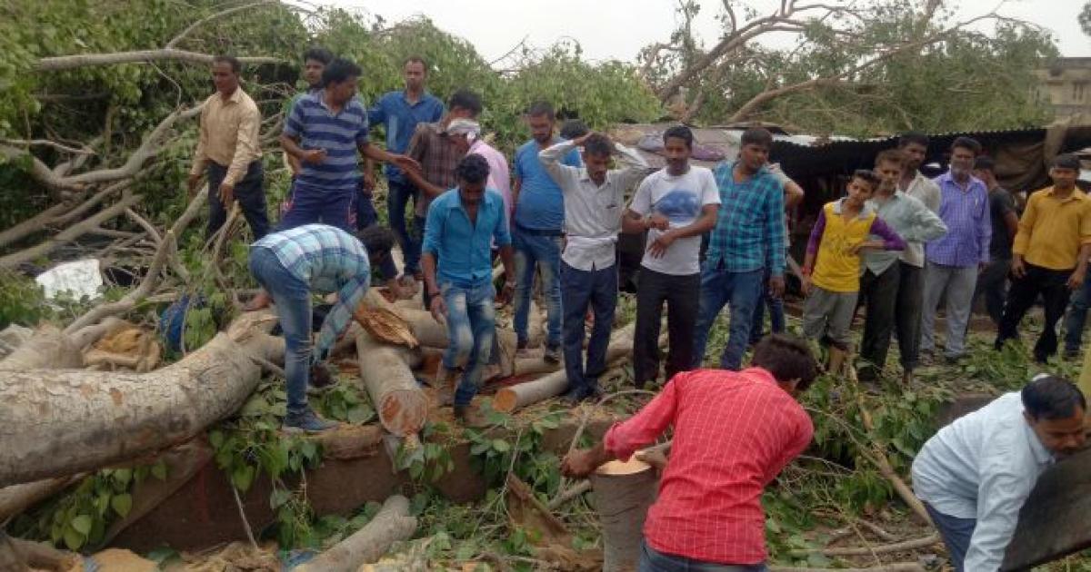 IMAGE: People remove the logs of uprooted trees after strong winds and a dust storm in Alwar, Rajasthan. Photograph: Reuters