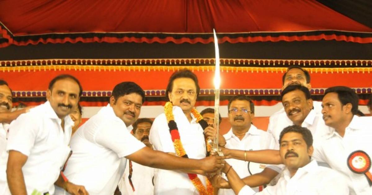 Image: DMK working president M K Stalin (holding a sword) with party functionaries. Photograph: Courtesy, M K Stalin's Facebook page.