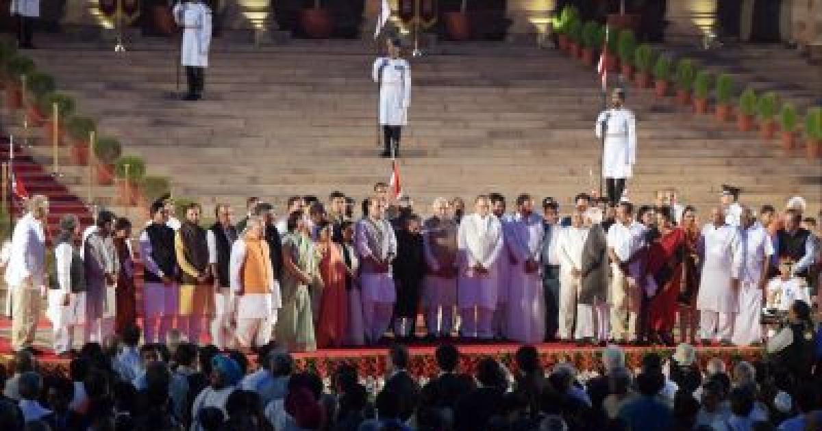 President Pranab Mukherjee, Vice President Hamid Ansari, Prime Minister Narendra Modi and Council of Ministers after the swearing-in ceremony at Rashtrapati Bhavan in New Delhi on Monday. Photograph: Manvender Vashist/PTI Photo.