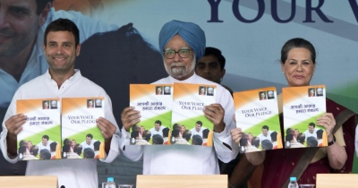 Image: Prime Minister Manmohan Singh, Congress president Sonia Gandhi and vice president Rahul Gandhi present the party's manifesto in New Delhi on March 26, 2014. Photo courtesy: INC website