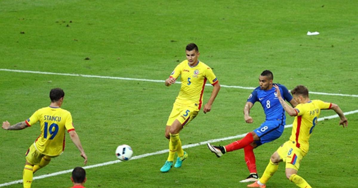 IMAGE: France's Dimitri Payet scores his team's second goal against Romania in the opening game of Euro 2016 in Paris, June 11, 2016. Photograph: Paul Gilham/Getty Images