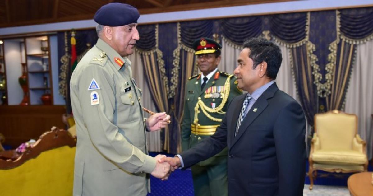 IMAGE: Pakistan's army chief General Qamar Javed Bajwa, left, with Maldives President Abdulla Yameen Abdul Gayoom in Male, April 1, 2018. Photograph: Kind courtesy The Maldives President's Office