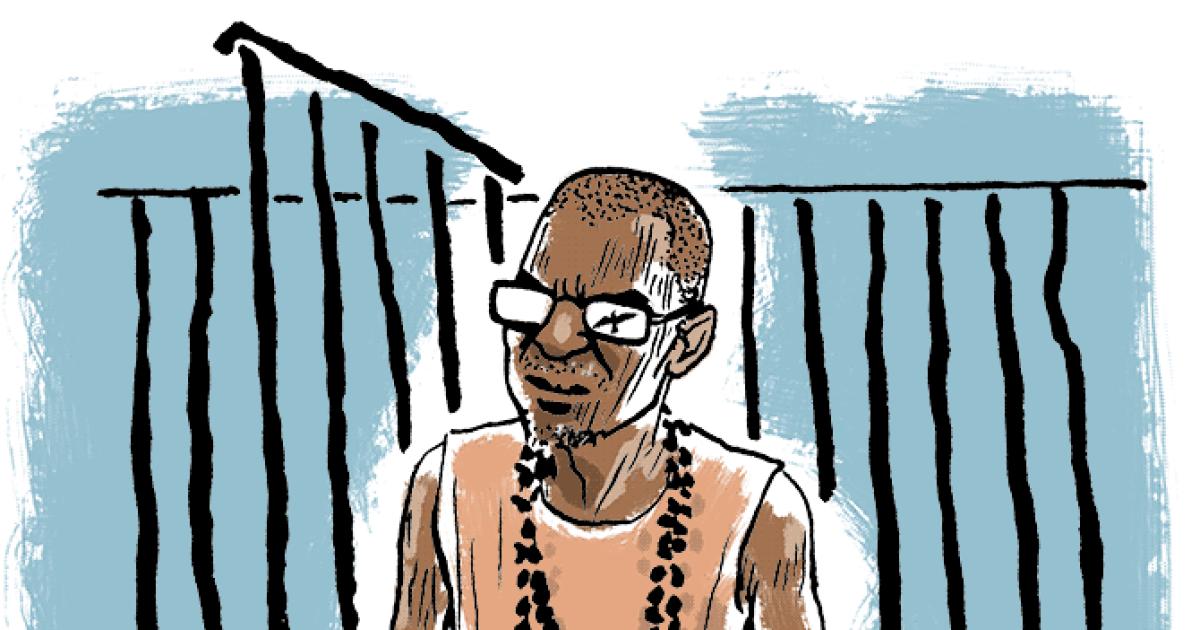 His gaunt frame is draped in faded saffron and his face is marked by a wispy white moustache and thick glasses.