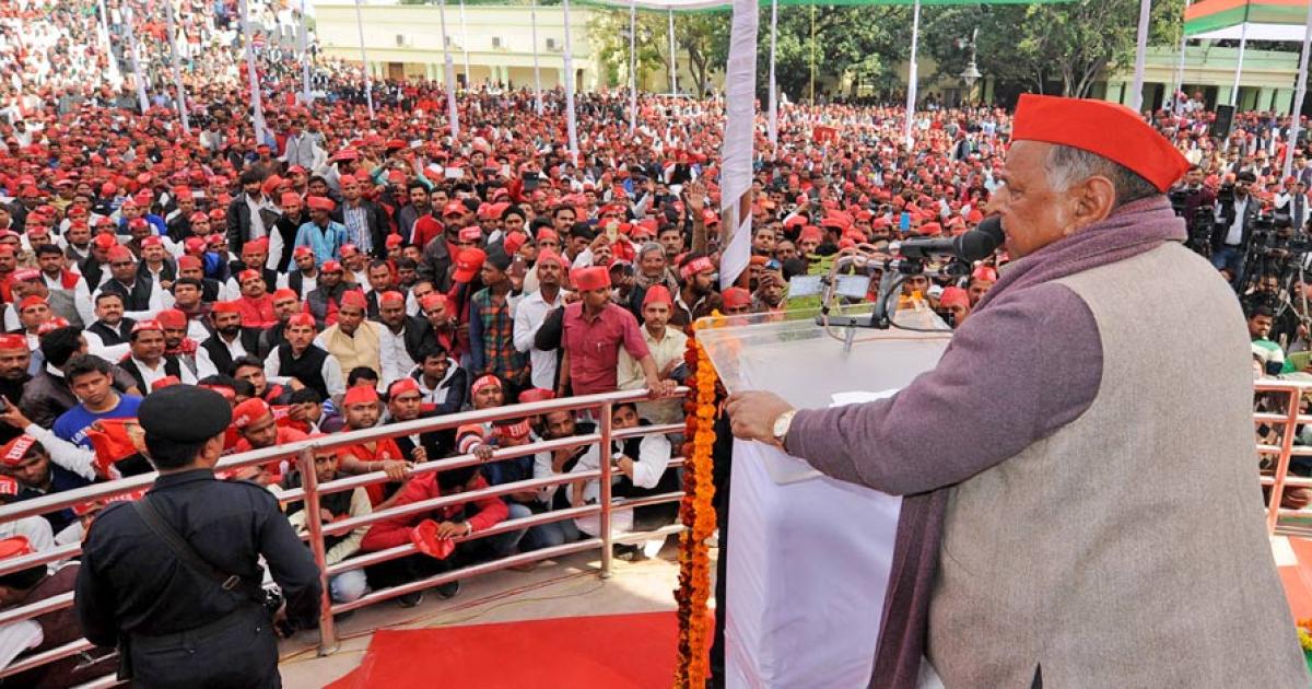 IMAGE: Mulayam Singh Yadav, then national president, Samajwadi Party addresses the Samajwadi Yuva Sammelan in Lucknow. Photograph: Sandeep Pal
