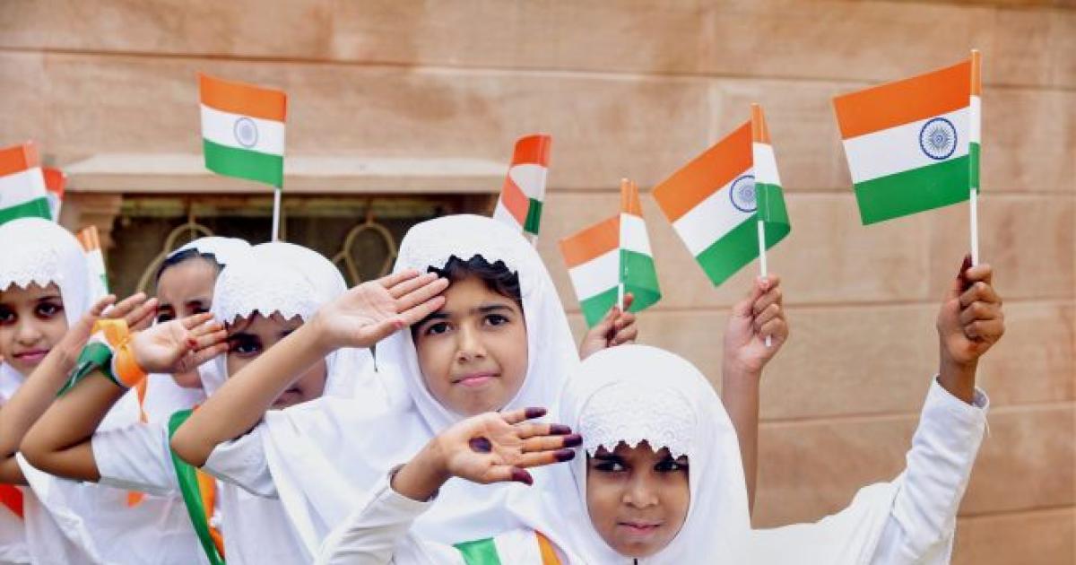 IMAGE: Students of the Maulana Abul Kalam Azad school in Jodhpur celebrate Independence Day. Photograph: PTI Photo