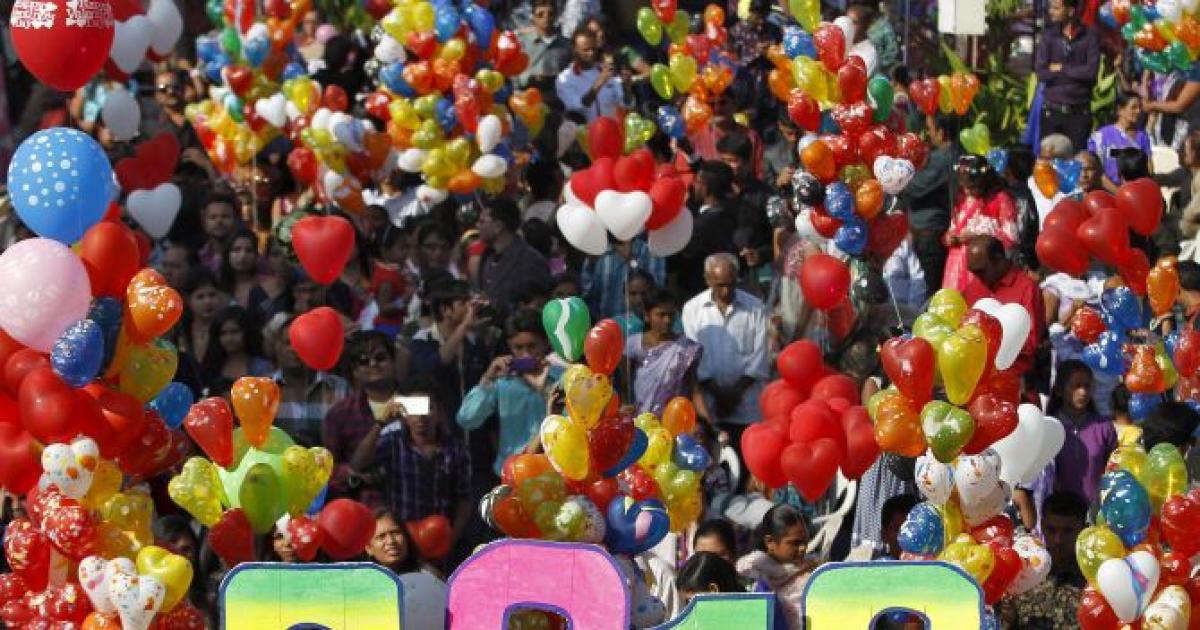 Image: People hold balloons during the New Year celebrations outside a church in Ahmedabad. Photograph: Amit Dave/Reuters