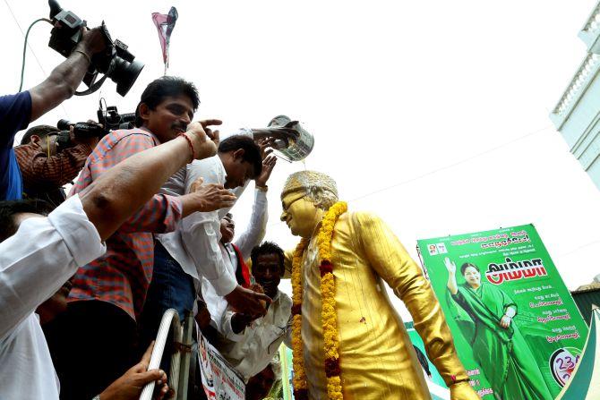 Photograph: Ecstatic AIADMK workers celebrate the party's victory by performing milk 'abhishekam' to founder M G Ramachandran's statue in the party headquarters in Chennai on Thursday. Image: Sreeram Selvaraj.