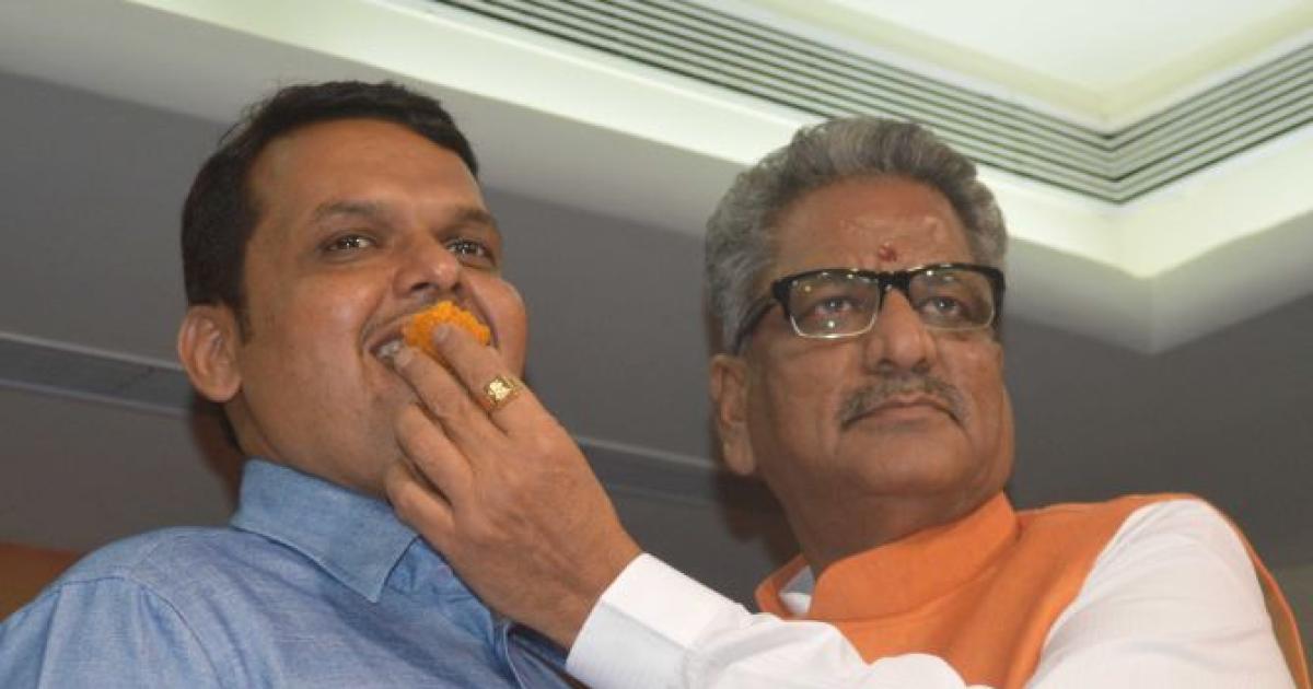 Image: Senior BJP leader O P Mathur feeds state BJP President Devendra Fadnavis a laddoo. Photograph: Deepak Salvi