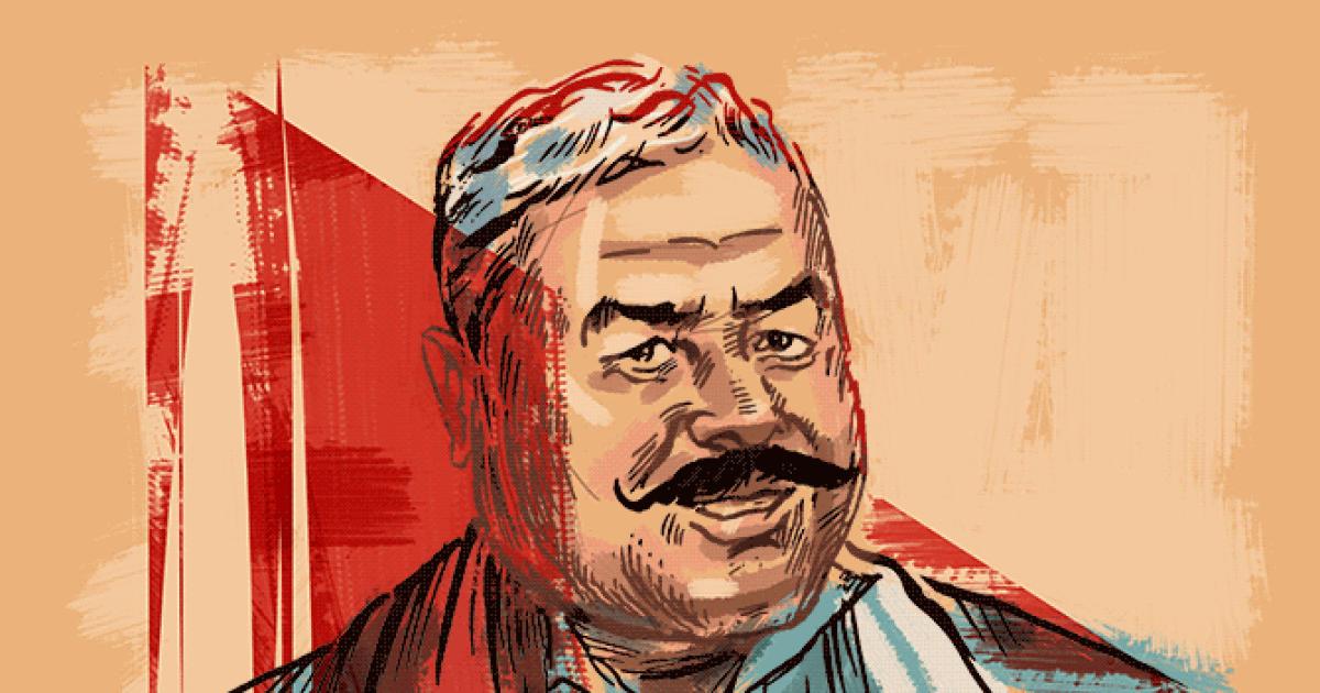 He is laughing, proud moustache curled upwards and eyes looking fearlessly at the camera.