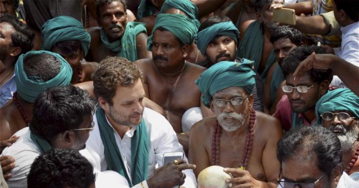 IMAGE: Congress vice president Rahul Gandhi with Tamil farmers who are agitating for loan waiver and compensation for crop failure at Jantar Mantar in New Delhi. Photograph: Vijay Verma/PTI Photo.