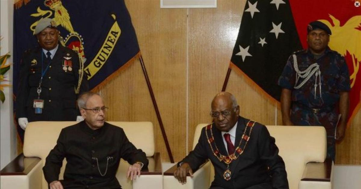 Image: President Pranab Mukherjee with the governor general of Papua New Guinea, Sir Michael Ogio, at the Government House, Port Moresby in Papua New Guinea on April 28, 2016. Photograph courtesy: Rashtrapati Bhavan.