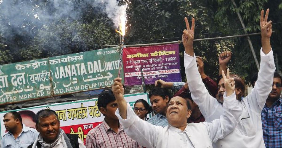 IMAGE: Janata Dal-United supporters celebrate in New Delhi. Photograph: Anindito Mukherjee/Reuters