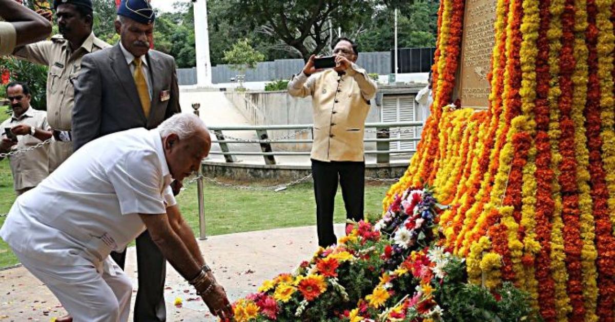 IMAGE: BJP leader BS Yeddyurappa pays tribute at the National Military Memorial in Bengaluru on the occasion of Kargil Vijay Diwas on July 26, 2019, ahead of his swearing-in as chief minister. Photograph: ANI Photo