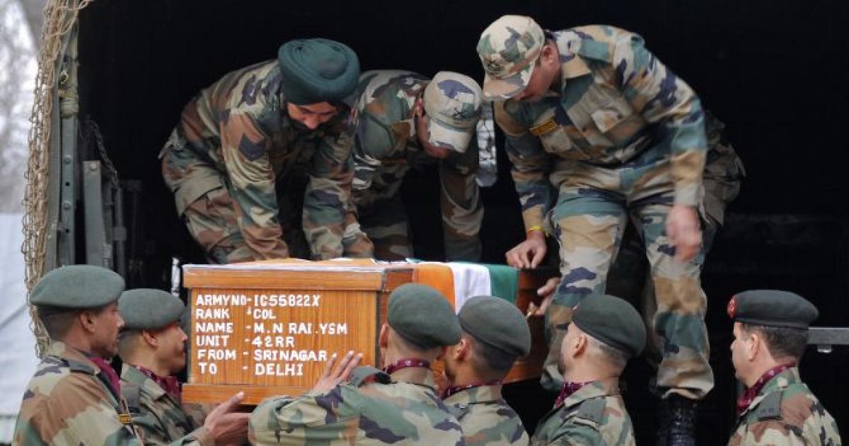 Image: Soldiers carry Colonel M N Rai's coffin. The colonel was killed in a gun battle with terrorists in Kashmir. Photograph: Reuters