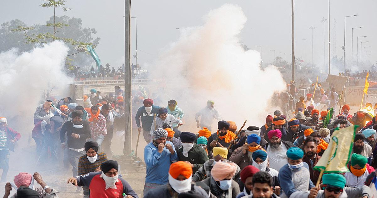 IMAGE: Farmers run for cover amidst tear gas fired by the police to disperse them at the Shambhu barrier, February 21, 2024. Photograph: Anushree Fadnavis/Reuters