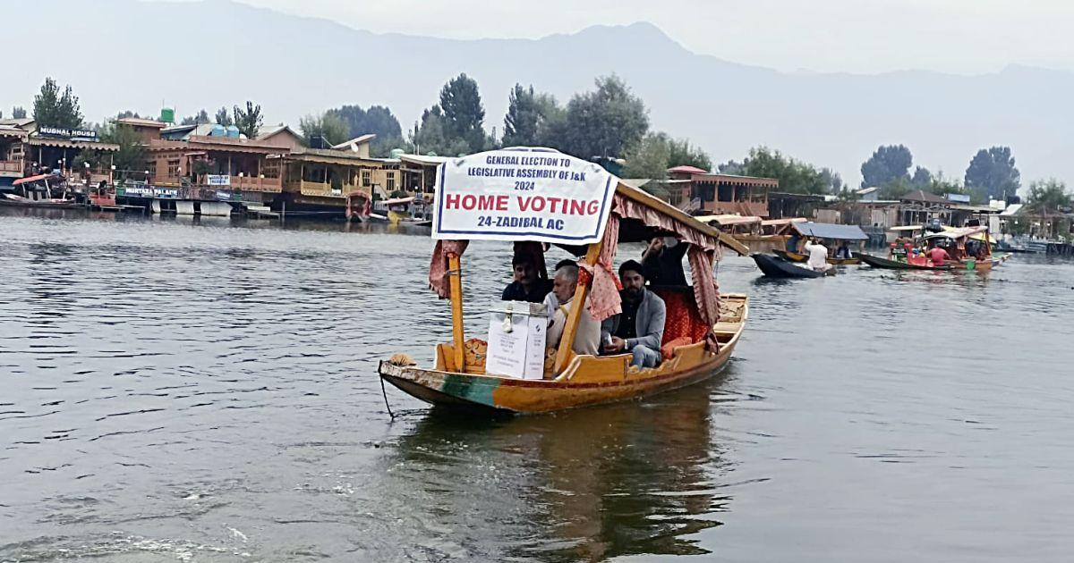 IMAGE: Polling officials ride a shikara on the Dal Lake in Srinagar, September 19, 2024, as they reach the Zadibal constituency under the 'voting from home' facility for the Jammu and Kashmir assembly elections. Photograph: ANI Photo
