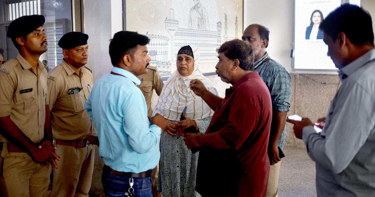 IMAGE: Rafiq Memon and Salma Memon, relatives of Javed Ali Syed, who along with his wife and two children died after the Air India Boeing 787-8 Dreamliner plane bound for London's Gatwick airport crashed after take-off from Ahmedabad, speak to the police outside the DNA sample collection room at Ahmedabad's Civil Hospital, June 14, 2025. Photograph: Adnan Abidi/Reuters