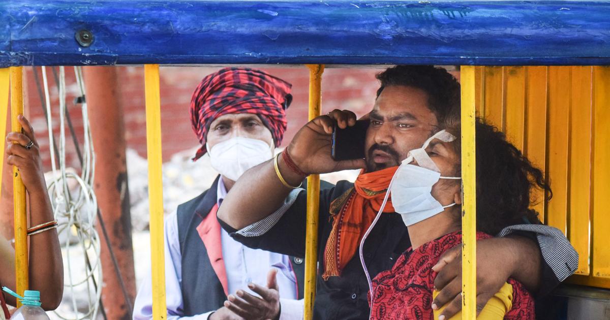 IMAGE: A COVID-19 patient is brought in an e-rickshaw for treatment at the Swaroop Rani Nehru Hospital in Prayagraj in the Bharatiya Janata Party ruled state of Uttar Pradesh, May 4, 2021. Photograph: PTI Photo