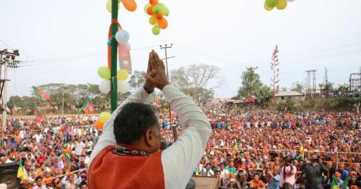 IMAGE: BJP leader Sunil Deodhar addresses an election rally in Karbook, South Tripura. Photograph: Kind courtesy: Sunil Deodhar/Twitter