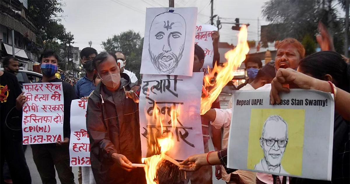 IMAGE: People protest in Ranchi on July 5, 2021 after the death of tribal activist Father Stan Swamy, an accused in the Elgar Parishad case, in a Mumbai hospital. Photograph: PTI Photo