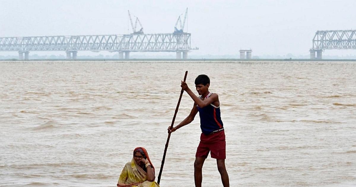 Image: Villagers using a temporary raft navigate on the Ganga in Patna. Photograph: Krishna Murari Kishan/Reuters