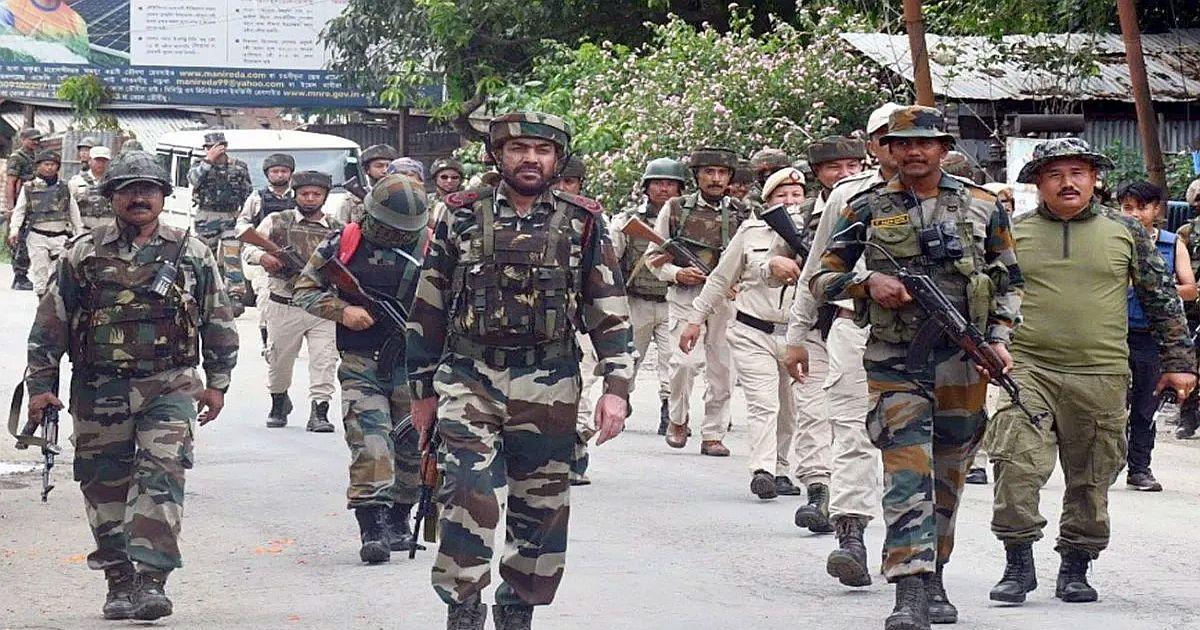 IMAGE: Security personnel conduct combing operations in sensitive areas in both the Hills and Valley sectors of Manipur.