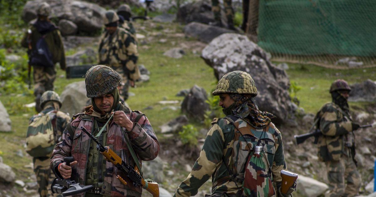 IMAGE: Border Security Force soldiers patrol a highway as an army convoy passes towards Leh. Photograph: Yawar Nazir/Getty Images