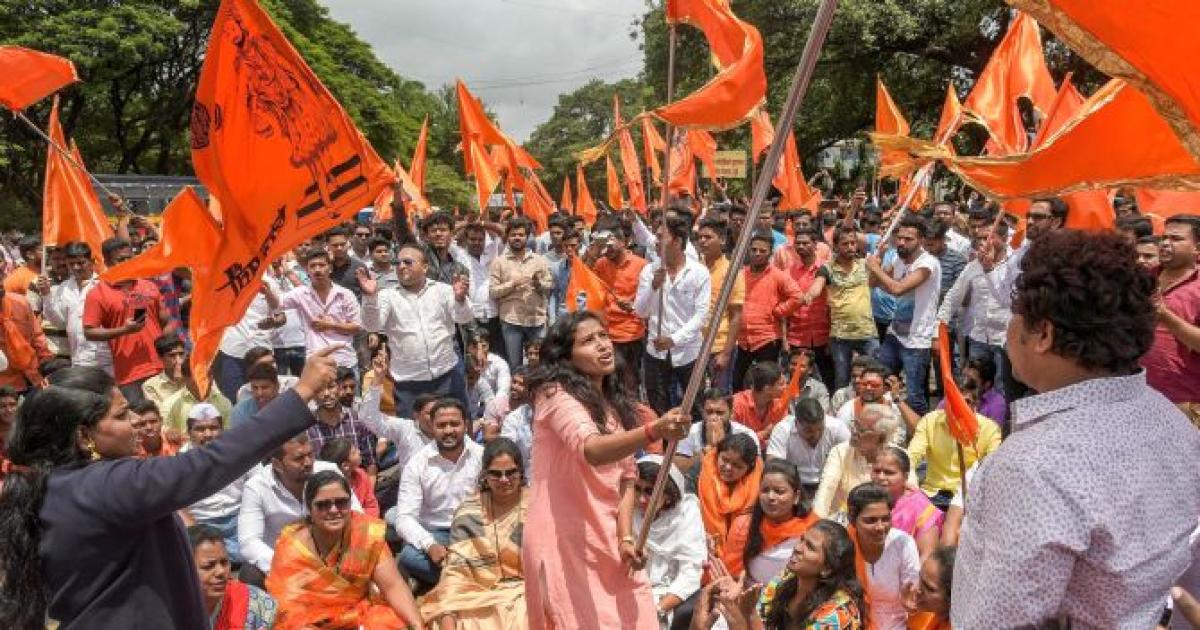 IMAGE: Maratha Kranti Morcha activists protest for reservations for the Maratha community at the district collector's office in Pune in 2018. Photograph: PTI Photo