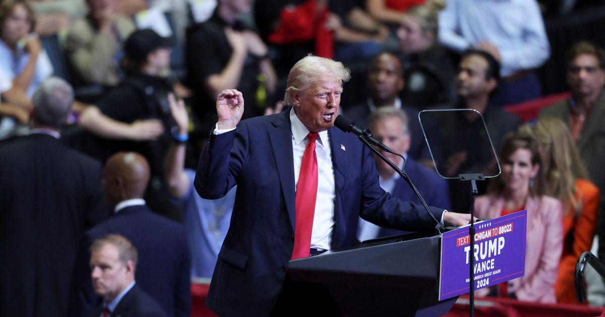 IMAGE: Republican presidential nominee and former US president Donald J Trump at the first campaign rally with his running mate J D Vance in Grand Rapids, Michigan, July 20, 2024. Photograph: Tom Brenner/Reuters