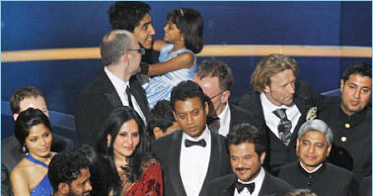 IMAGE: Ambassador Vikas Swarup, standing behind Anil Kapoor, as Slumdog Millionaire, based on his book Q&A, wins the Oscar for Best Picture. Photograph: Gary Hershorn/Reuters